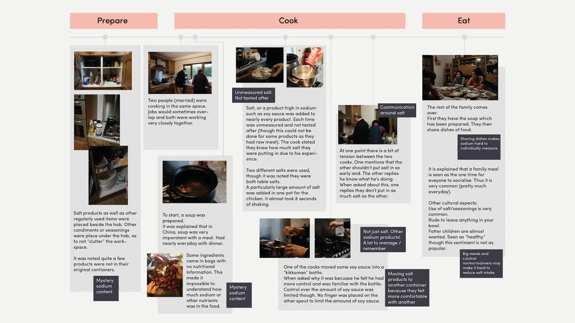Through extensive secondary research it was learnt that unlike western diets (where most salt intake comes from processed foods) - Chinese salt intake comes mostly from home cooking. I conducted questionnaires on salt usage in cooking to support this data.