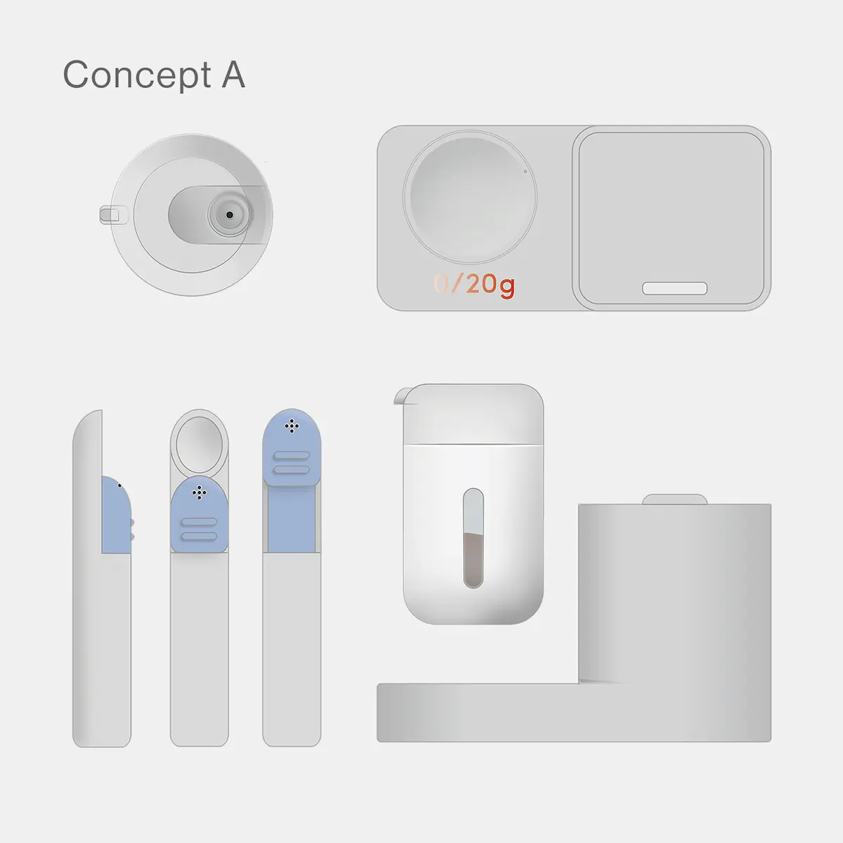 Concept A uses a spoon that can scoop 1g amounts of salt from a smart container