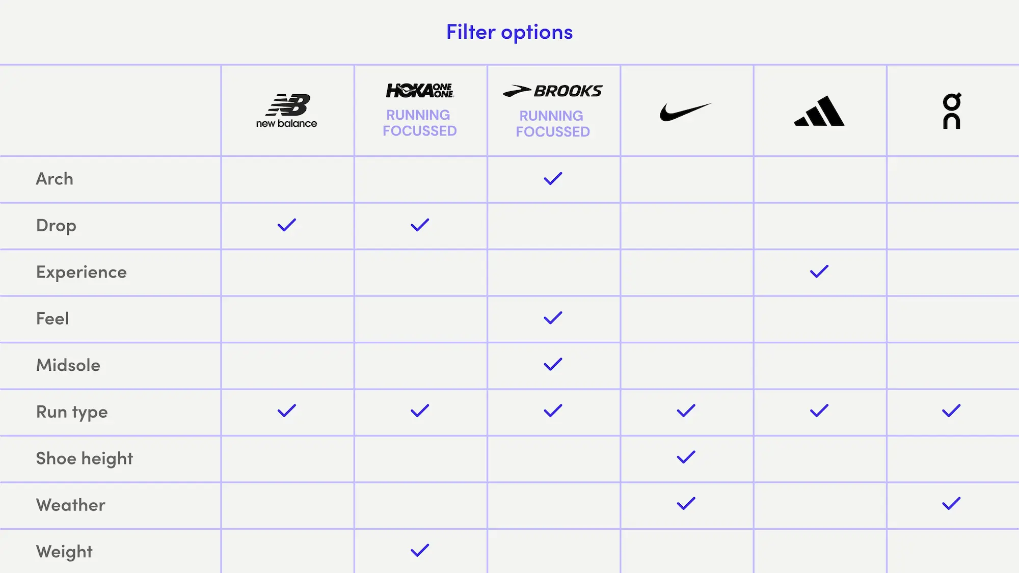 Customers may struggle to compare running shoes due to inconsistent presentation of key specifications. We recommended introducing a standardised list of features (such as weight, support, fastening method, and drop).