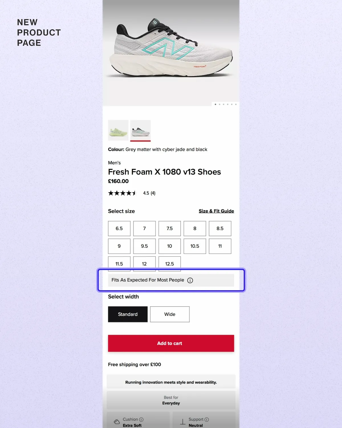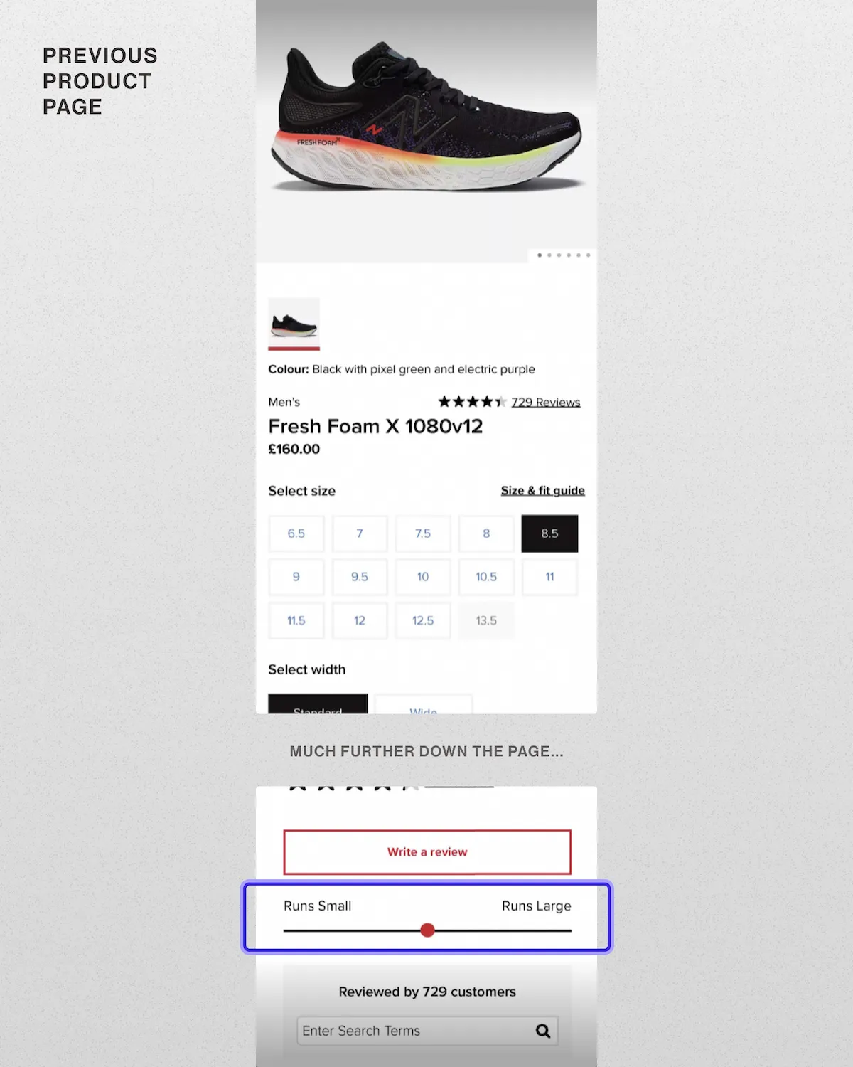 Additionally, the "true to size" indicator is currently positioned within customer reviews. We recommended moving it higher up, next to the size selector.