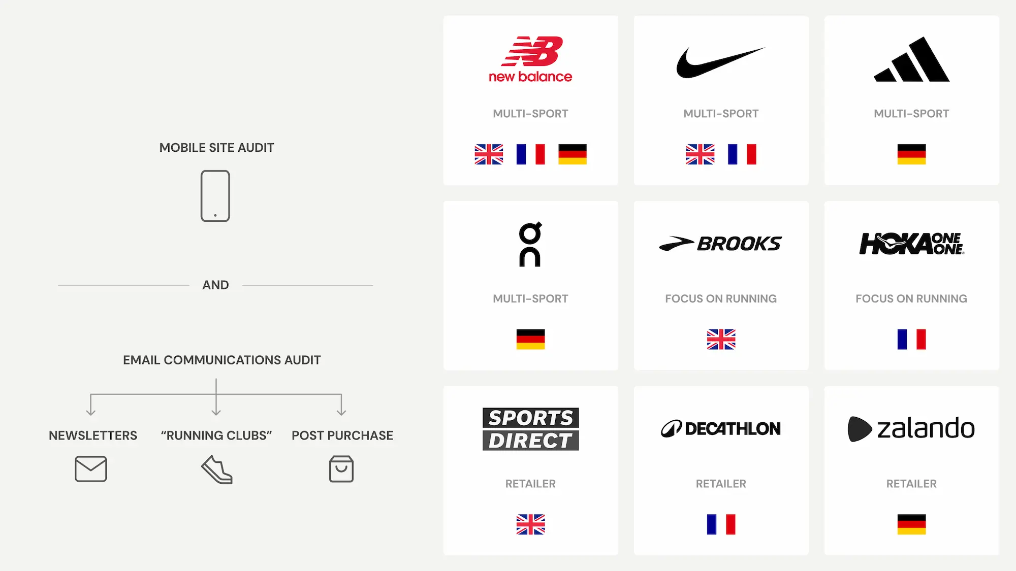 To evaluate New Balance's market position, we conducted an audit of its website alongside competitor sites in the UK, France and Germany.